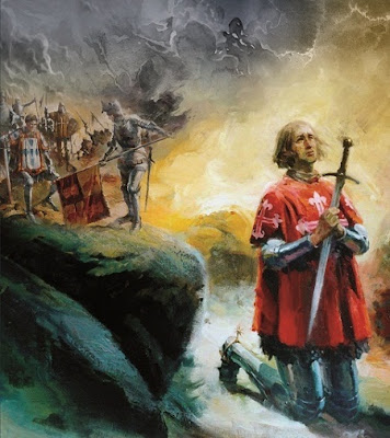 «– Amigos, de mim não sei que vos diga mais do que já disse; mas enfim vou responder às razões que me destes, uma por uma. A primeira, dos Castelhanos serem grandes senhores, tanto maior honra e louvor vos será de os vencerdes. Quanto à dúvida que tendes por ali virem meus irmãos, eu vos digo e prometo de verdade que ainda que lá viesse meu pai, eu seria contra ele, por servir o Mestre, meu senhor, e defender a terra que nos criou. E para verdes que assim é, se quiserdes ser comigo nesta obra, eu vos juro que serei o primeiro que a comece, para verdes a vontade que tenho neste feito contra eles. E enfim, pela parte de sermos poucos e eles muitos, não duvideis por isso de irdes a tal obra, pois muitas vezes aconteceu os poucos vencerem os muitos, que o vencimento está em Deus e não nos homens. Mas já que assim é, rogo-vos que aqueles que quiserem ir comigo a esta obra se passem da parte d'além deste regato, os que não quiserem fiquem de cá».